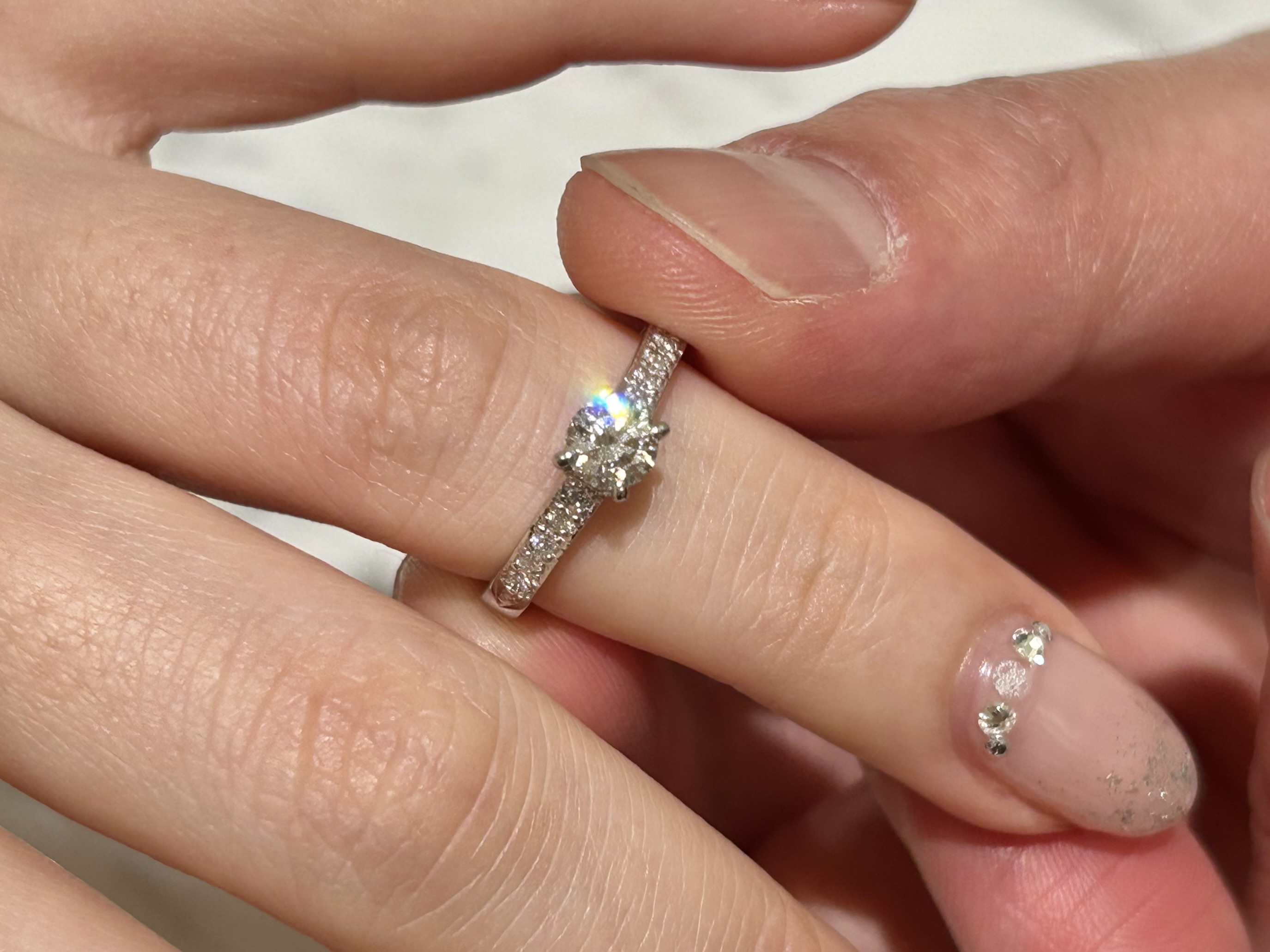 婚約指輪を探して来店しましたが、親身に相談に乗ってくださり、安心して選ぶことができました。実際にいくつも試着させていただく中で、自分の指に一番しっくりくるデザインが見つかり、とても嬉しかったです。